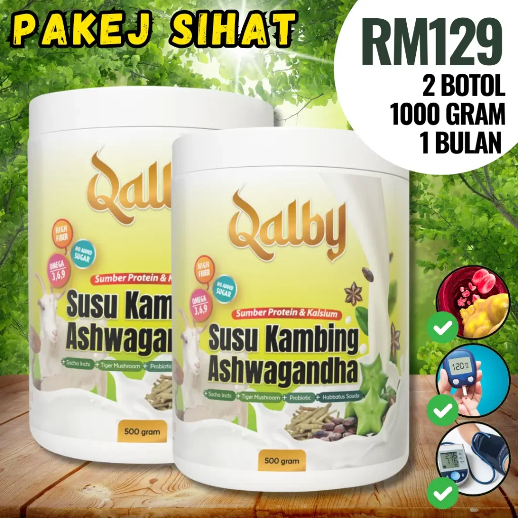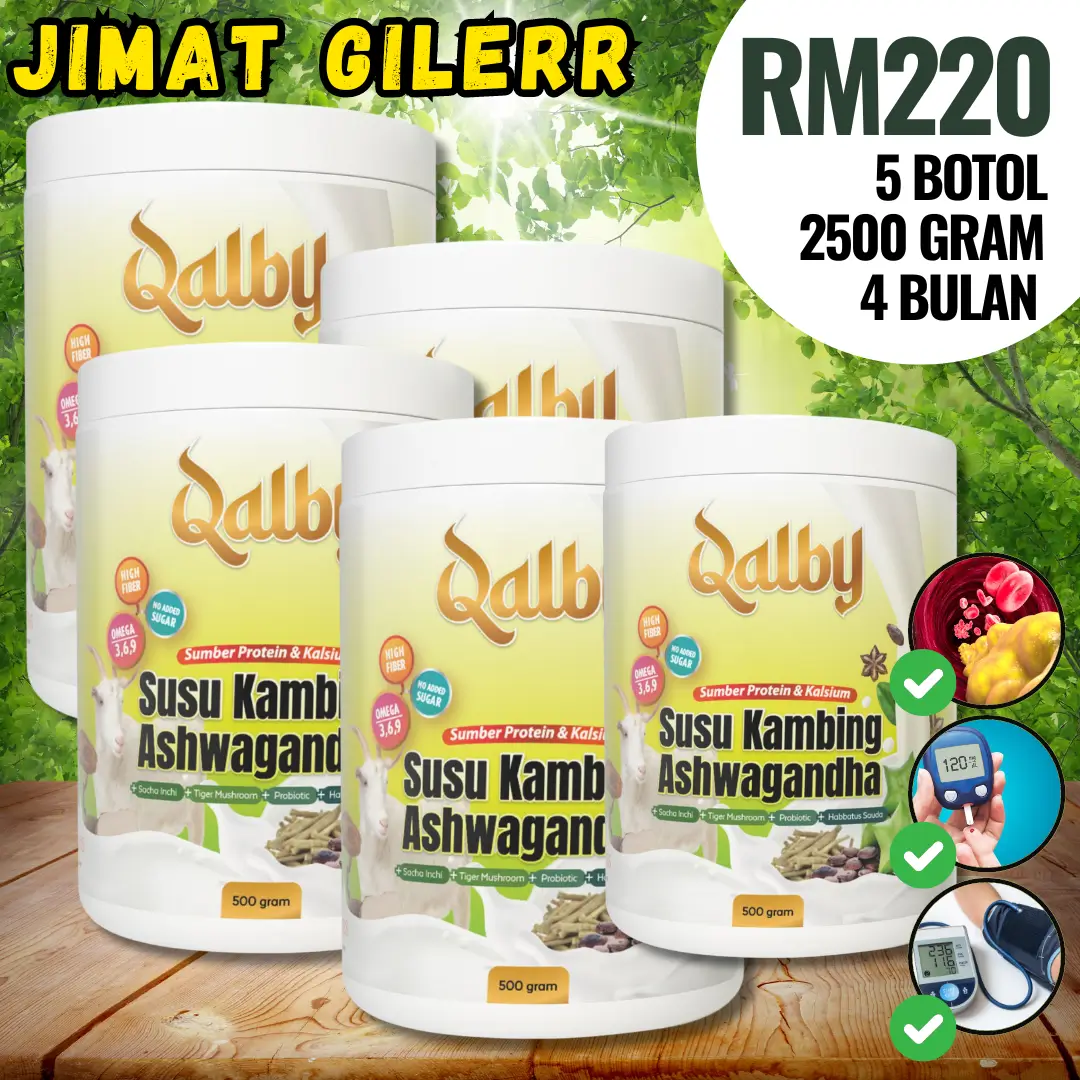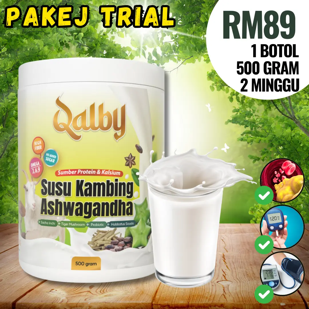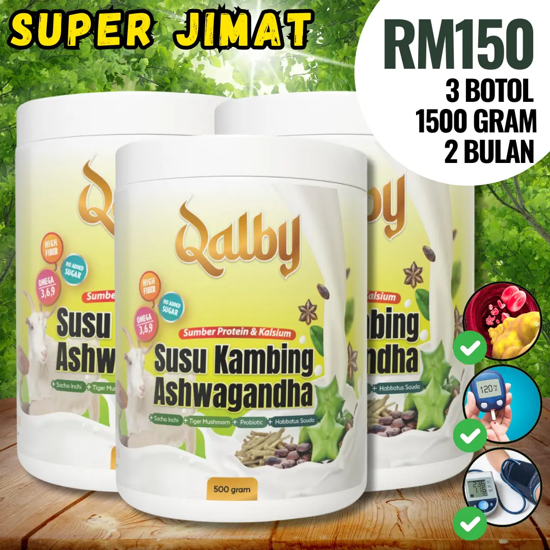 KETIGA : Anda bagi peluang untuk cuba QALBY SUSU KAMBING ASHWAGANDHA ini hari ini juga. Anda akan dapat rasai perubahan tahap kesihatan anda sejak hari pertama. Gula dalam darah lebih stabil, tiada lagi masalah darah tinggi, buah pinggang, masalah prostat, sakit jantung dan kolestrol.